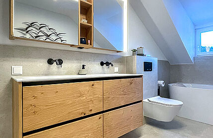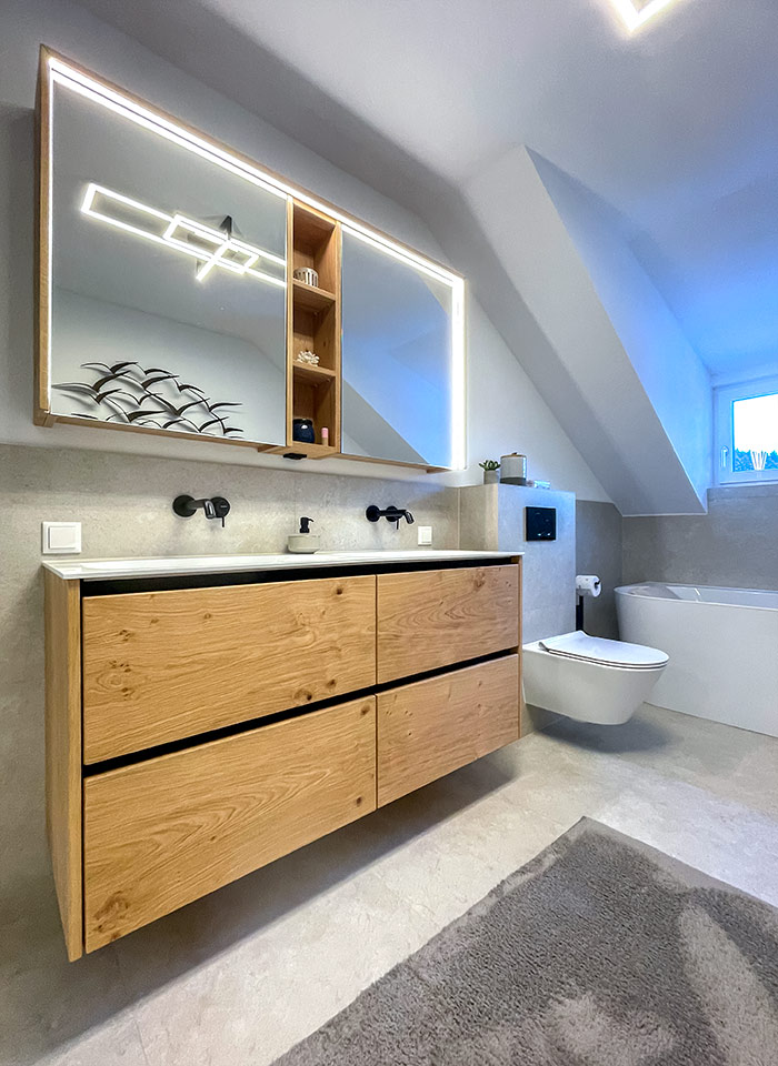 Mit einer Lösung der Tischlerei Edtmayer sind Sie bestens beraten. Wir planen Ihr Badezimmer ganz genau nach Ihren Wünschen und setzen es mit einer intelligenten Beleuchtung effektiv in Szene. So entsteht Harmonie für Körper, Geist und Seele, egal zu welcher Tageszeit.